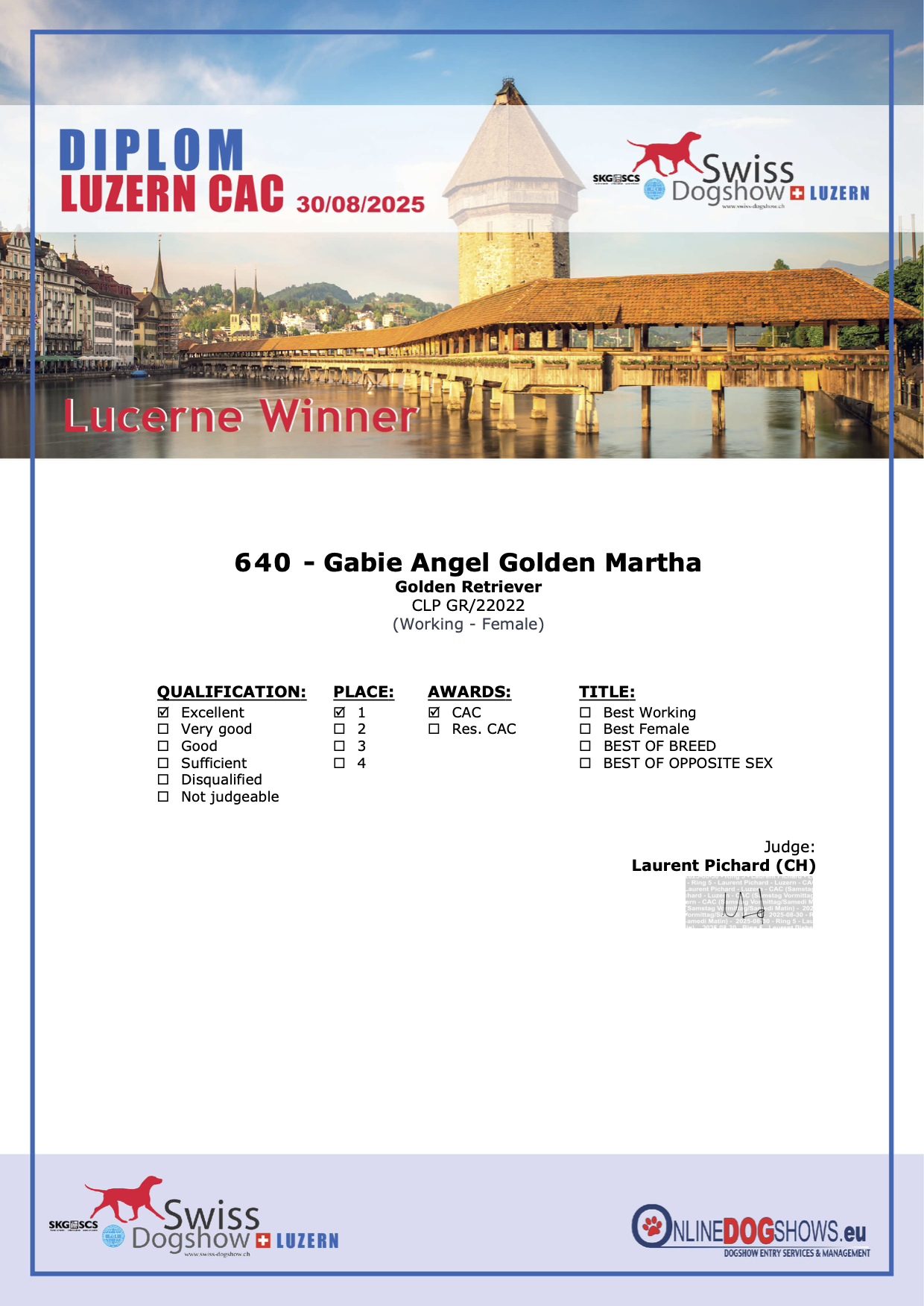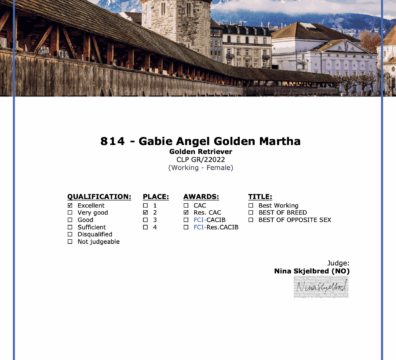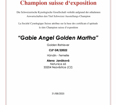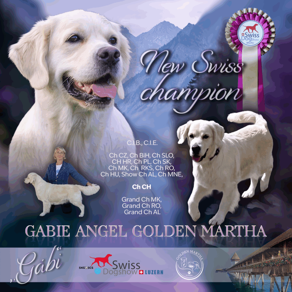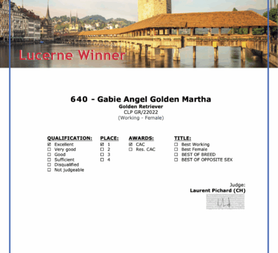 O víkendu jsme navštívili krásné město Luzern ve Švýcarku. V Luzernu probíhaly 3 výstavy, dvě v sobotu a jedna v neděli. Gábi jsem přihlásila do třídy pracovní. Na přiznání Švýcarského Šampiona Krásy nám zbýval jeden CAC z mezinárodní výstavy. A hurá, zařadilo se! Jako obvykle s námi byla moje milovaná Andělka, která s námi jezdí jako náš maskot :).