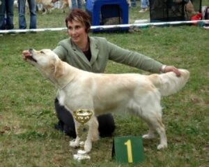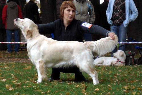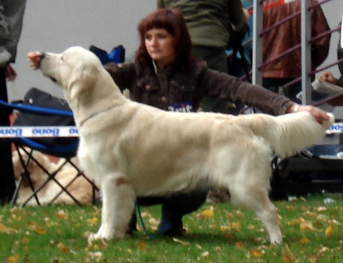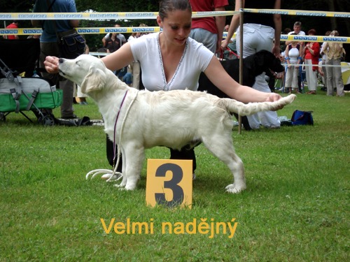 Posudek: 19-ti měs. světle zlatá fenka, velice příjemné typické hlavy, tmavé oko, výborně nasazený krk, správná hřbetní linie, oháňka správně nasazená, korektní pohyb, výborná srst, klidná povaha a výborně předvedená.