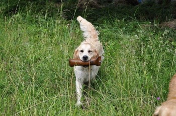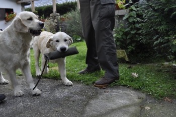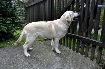 V sobotu jsem měla cestu kolem Babylonu, tak jsem navštívila letošní štěňátko z vrhu B Jacka (Blueberry Golden Martha). Měla jsem sebou i jeho maminu Martičku. Jack je velmi temperamentní štěňátko, který má nejspíš obrovskou radost z každé návštěvy. Nejvíce ho však zajímala Martička, na kterou skákal a běhal za ní, taky si obhlídl na krátkou chvíli její bříško, jestli by z cucíků něco nekáplo. Bylo vidět, že ač už je Jackovi 5. měsíců, tak vůbec nezapomněl na to, kde pil od své maminy mlíčko. Martička jeho skákání ze začátku tolerovala, ale když už to bylo moc a Jack nepřestával, tak ho začala po psím vychovávat. Taky jsem Jackovi přivezla půl kilového dummy. Měla jsem radost, že vůbec neváhal a ihned dummy začal brát a nosit. Je vidět, že se mu páníčkové věnují, že má základní poslušnost. Chtěla jsem ho také vyfotit v postoji, ale to nám tedy spolu vůbec nešlo. Tak mám pár fotek ve volném postoji, kde za vrátky kouká na Martu. Několik fotek z této návštěvy jsem vložila do Jackovi fotogalerie.