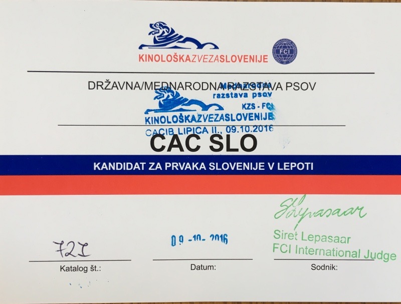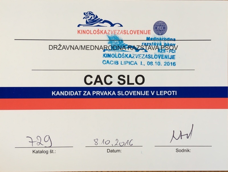 Meggi (Claudie Love GM) opět bodovala na dvoudenní CACIB výstavě v Lipici. V sobotu posuzovala rozhodčí z Estonska paní Siret Lepasaar a Meggi od ní obdržela známku Výbornou 1, CAC. Neděle byla jako přes kopírák – Výborná 1, CAC, jen posuzoval rozhodčí ze Švýcarka pan Laurent Pichard. Škoda, že se teď od 1.1.2016 ve Slovinsku zpřísnily podmínky pro udělení šampiona, protože Meggi už má 4 tituly z této země, ale to je ještě málo, potřebuje titul ze speciální výstavy. Třeba se zadaří příští rok.