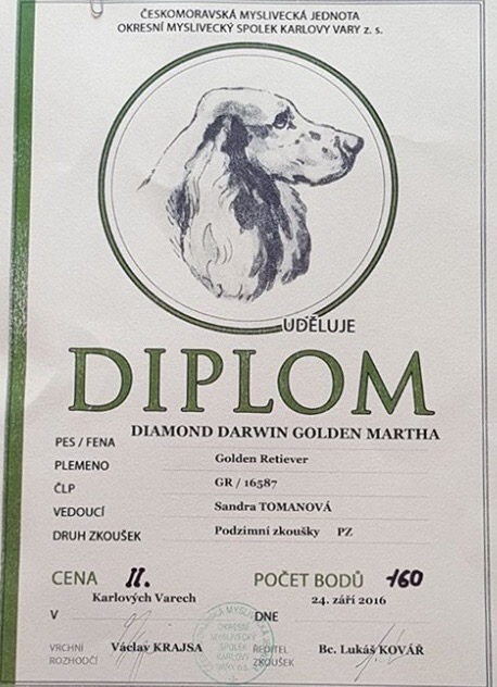 Darwin se zúčastnil Podzimních zkoušek pořádaných OMS Karlovy Vary. Celkově se umístil na krásném 2. místě ve 2. ceně a se 160. body. Darwin se tak stává lovecky upotřebitelným psem a díky této zkoušce může Darwin na výstavách do třídy pracovní. Sandro a Darwine, moc gratuluji!