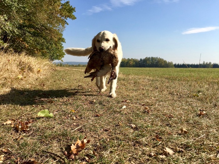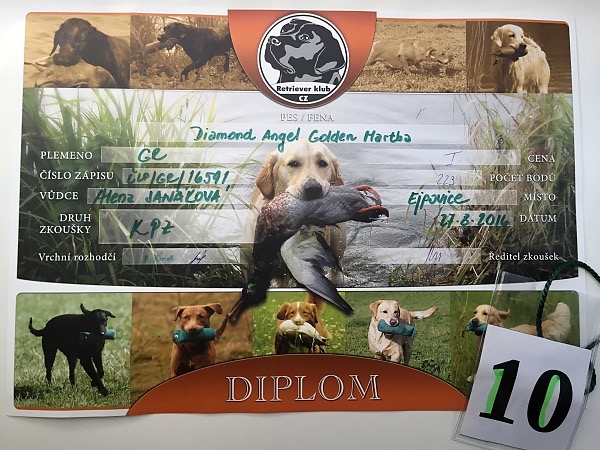 Na poslední chvíli jsem přihlásila Andělu na podzimní zkoušky, které se konaly kousek od nás v Ejpovicích a pořádal je Retriever klub CZ. Daleko bych s ní v tom vedru, které panovalo, nejela. I tak jsem dost velký cvok :). Startovalo 10 psů a Andělka se umístila na 3. místě. Zkoušky dokončila v I. ceně, 223 bodů. Je to moje šikulka.