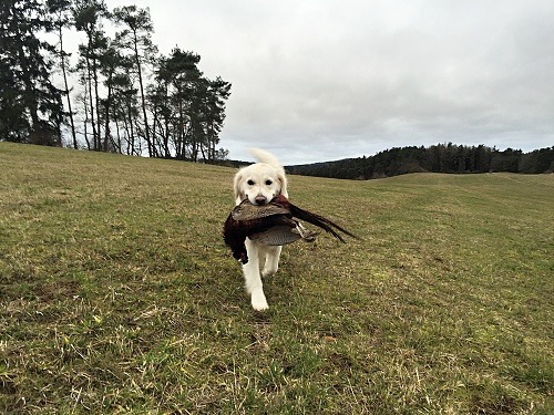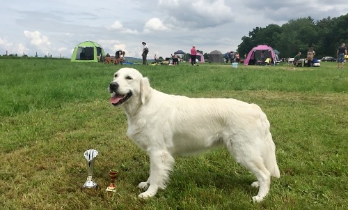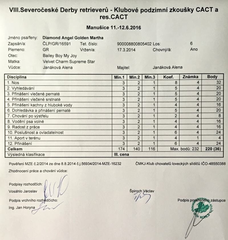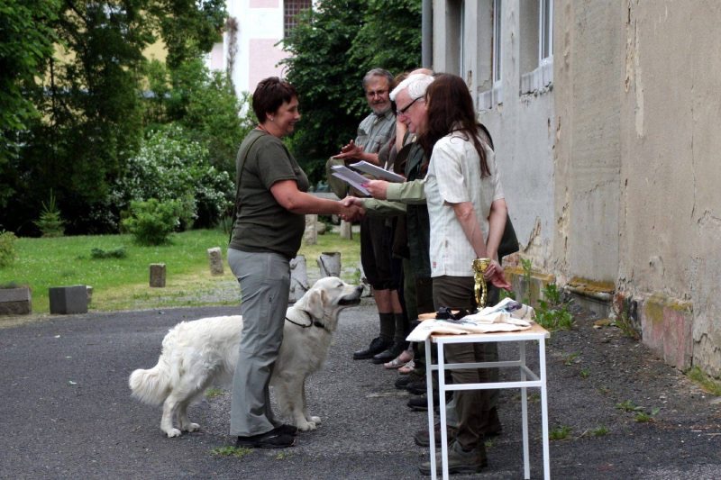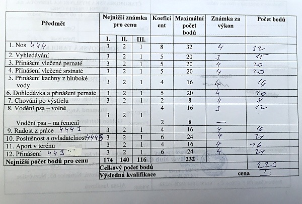 Andělka pracovala moc pěkně a to i v tom celodenním vytrvalém dešti. Kromě jedné 2, kterou schytala hned na první disciplíně – přinášení vlečené pernaté, obdržela samé 4. Celkově se umístila na 5. místě, II. cena, 222 bodů.