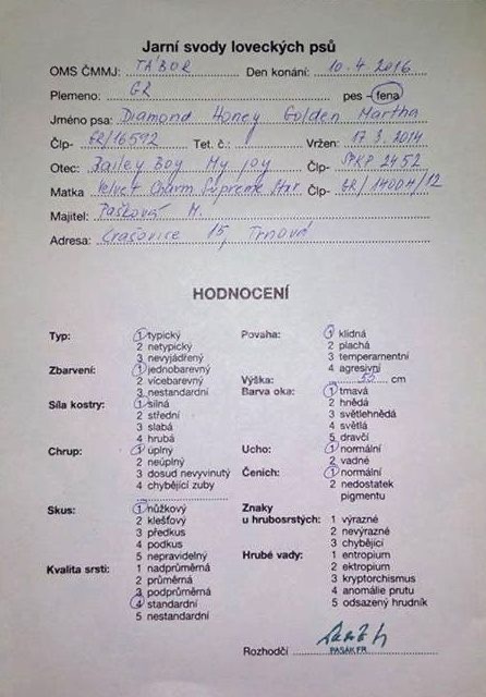 V sobotu se vystavovala Honey (Diamond Honey GM) na Krajské výstavě psů, která se konala v kempu Džbán v Praze. Ve třídě otevřené obdržela od paní rozhodčí Dolejšové známku Výborou 2. Moc gratuluji Martino!