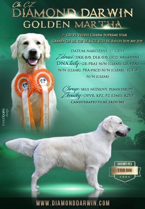 Darwin (Diamond Darwin Golden Martha) má svoje osobní stránky, kde o něm najdete všechny informace – zdraví, výstavy, zkoušky …….