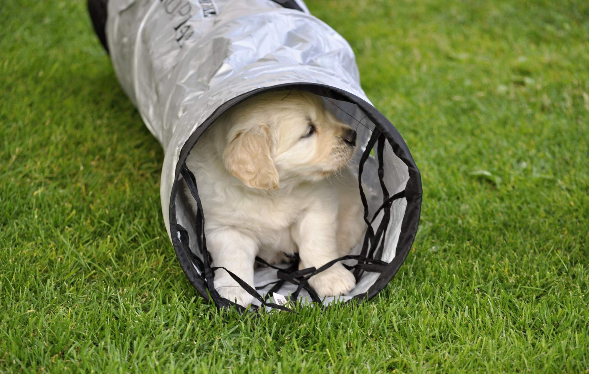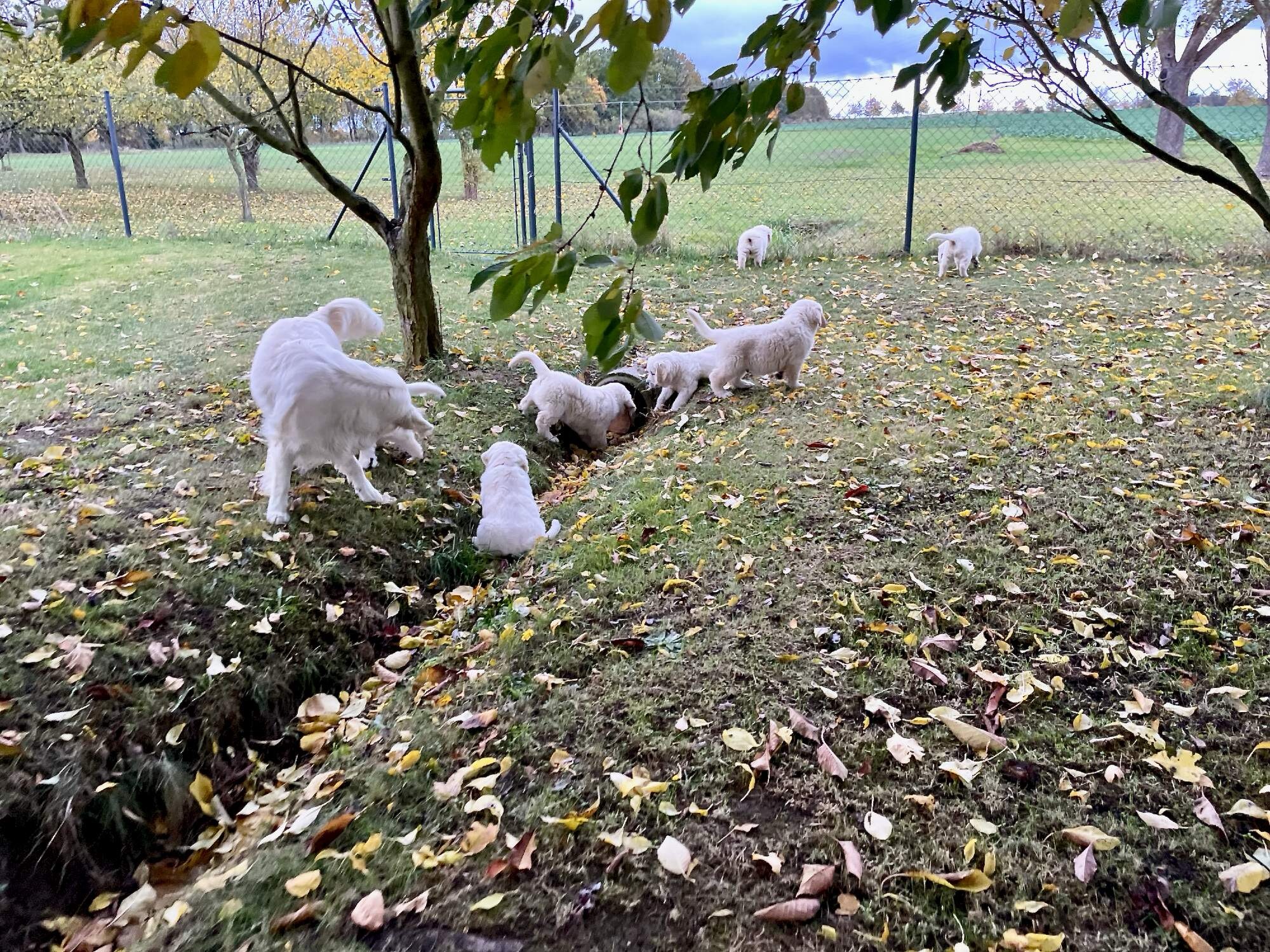 Jakmile je vidět, že ohrádka už štěňátkům nestačí, mají (v teplých měsících) k dispozici naši velkou zahradu. Ta je uzpůsobena pro jejich potřeby – bezpečná, plná nových vjemů, ale zároveň klidná.