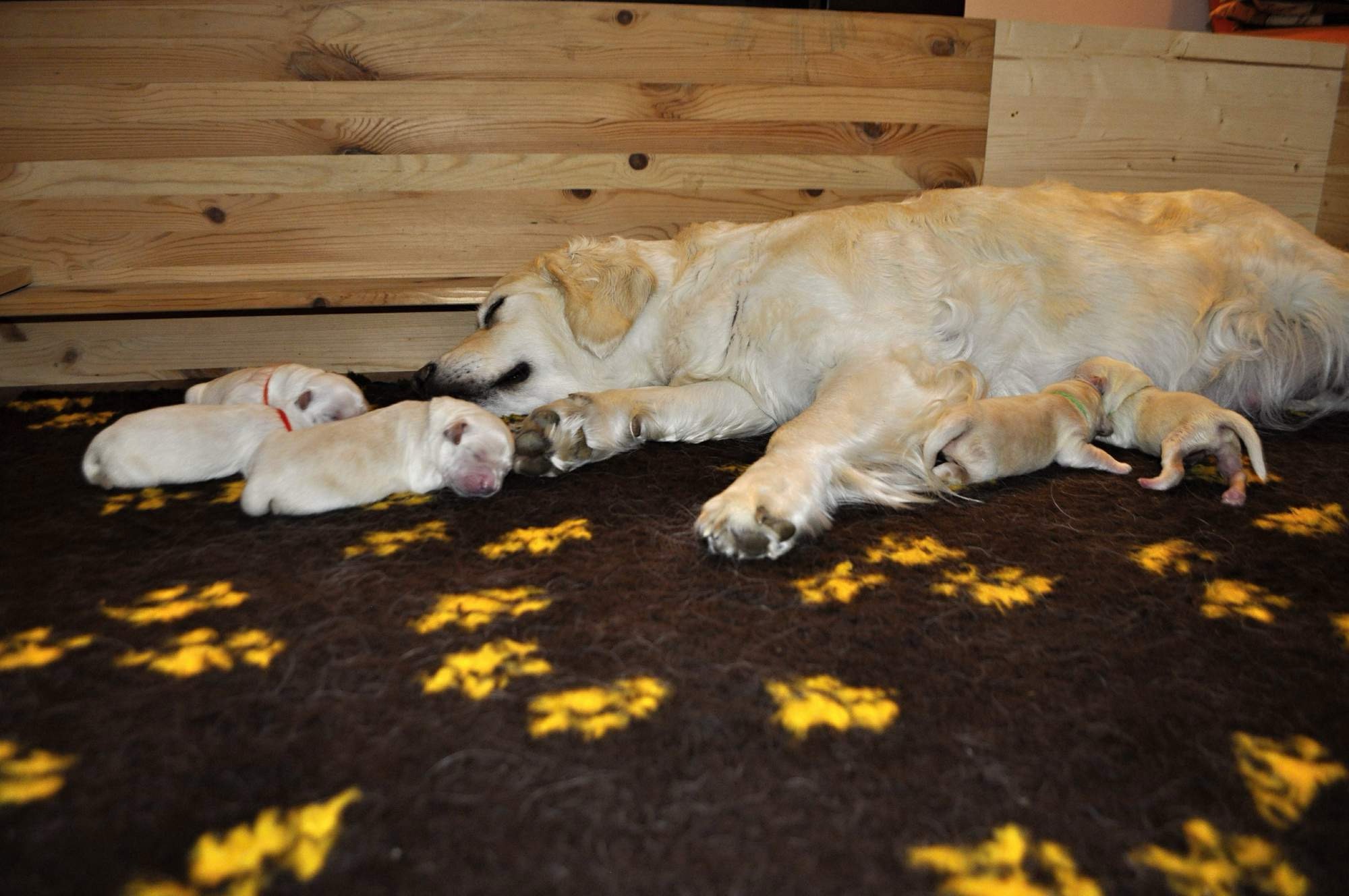 V první polovině březosti vše necháváme probíhat zcela přirozeně. Fenku nijak nestresujeme a dopřáváme jí klid. Ve druhé polovině se režim už přizpůsobuje jejím potřebám – a v posledních čtrnácti dnech před porodem je pod naším neustálým dohledem, 24 hodin denně. Porodní bedýnku jí připravujeme několik dní před očekávaným porodem. Umístěna je přímo v našem obývacím pokoji – tedy v prostoru, kde je fenka zvyklá být a kde se cítí bezpečně.