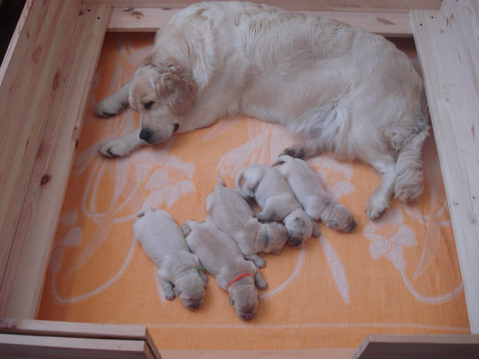 Po porodu tráví štěňátka první 3–4 týdny v dřevěné prostorné ohrádce. Jsou odchovávána v rodinném prostředí s nepřetržitou péčí. Jsme u nich doslova 24/7 – kontrolujeme jejich prospívání, sledujeme první krůčky, pečujeme o čistotu a především – zahrnujeme je láskou a kontaktem.