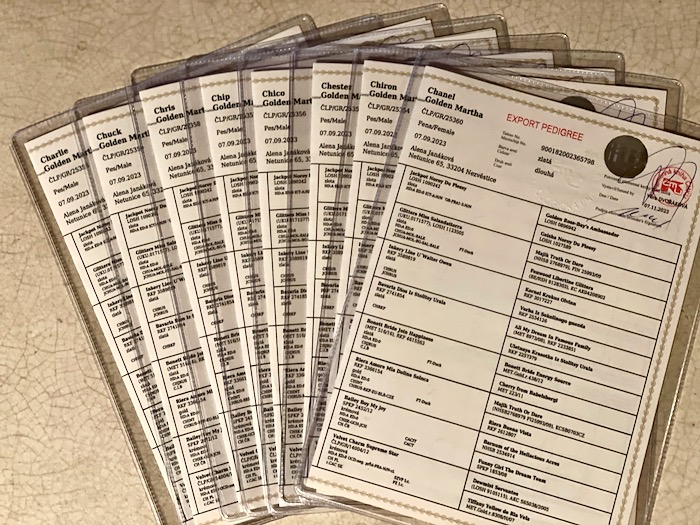 Když už mají štěňátka svoje čísla čipů, tak jsem každému vytvořila v celosvětové databázi retrívrů K9 rodokmeny.