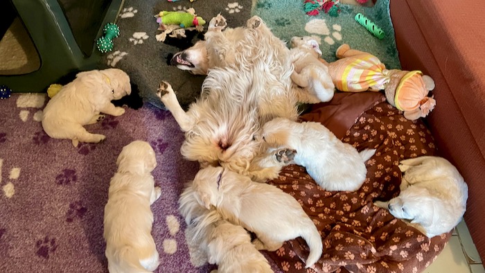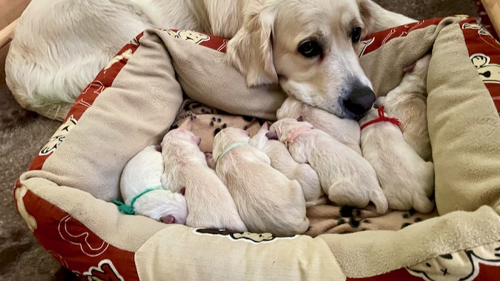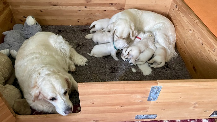 Gábi se z porodní bedýnka nehne. Nejraději by ani nečůrala :). Je to moje vzorná mamina a o štěňátka se s láskou stará. A já mám teď pro zatím jen jediný úkol a to starat se o maminu, aby jí nic nescházelo a byla spokojená. Myslím, že se nám to daří.