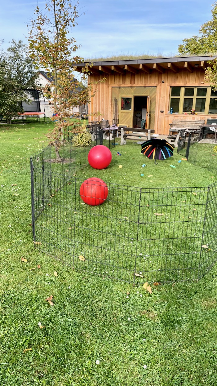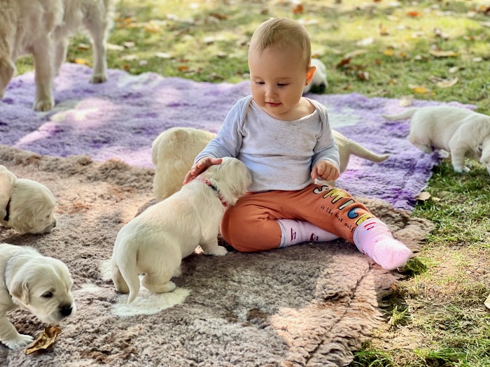 Dala jsem jim do výběhu velké balony a deštník a učím je si zvykat na různé předměty. Musím říct, že se jen tak něčeho nebo někoho nezaleknou. Tak snad jim to zůstane i v nových domovech. Jasně, že je nedokážu naučit a navyknout na rušný život města, kam někteří půjdou, ale pomáhám jim v poznávání světa alespoň takto. Slyší různé hluky – od traktůrku, sekačky, od dětí, od hodně dětí…. :-)). Na všechno je připravit nejde, to se pak musí pokračovat se seznamováním (socializací) u páníčků. Jsou jak nepopsaný papír a úplně všechno se musí naučit a tak jsme tu od toho my, abychom je na ten život připravili. Jejich mamina i babi je už také učí a zapojují se do her s nimi. Je radost se na ně dívat.