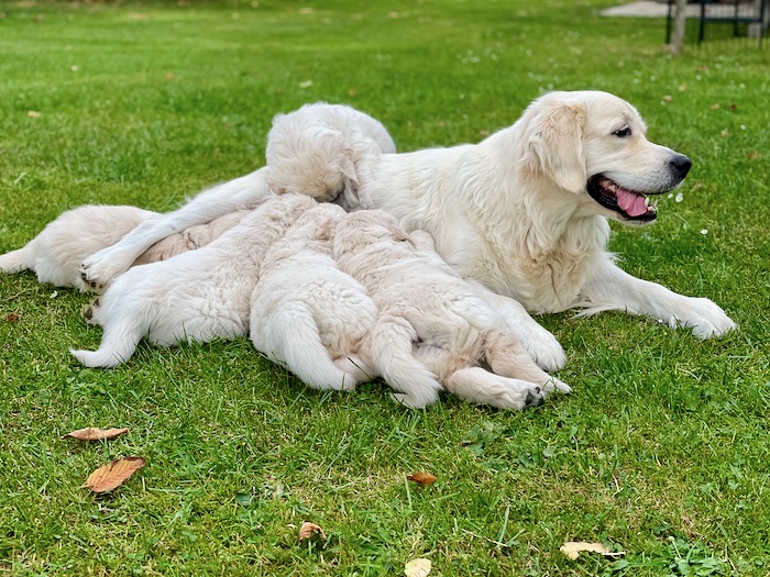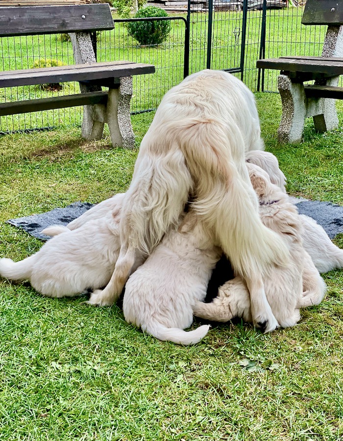 Pomalu nám končí 6. týden a štěňátka jsou čím dál tím víc zlobivější, možná zvědavější nebo odvážnější….. Každopádně je to pořádně náročné a nejen pro mě, ale i pro mámu Gábi. Ta už je kojí jen jednou až dvakrát denně, ale zatím kojí a poctivě stojí. Štěňátka jí nedají pokoj a na mlíčko jí vždycky udolají, že mi je jí až líto. Je to statečná mamina ♥