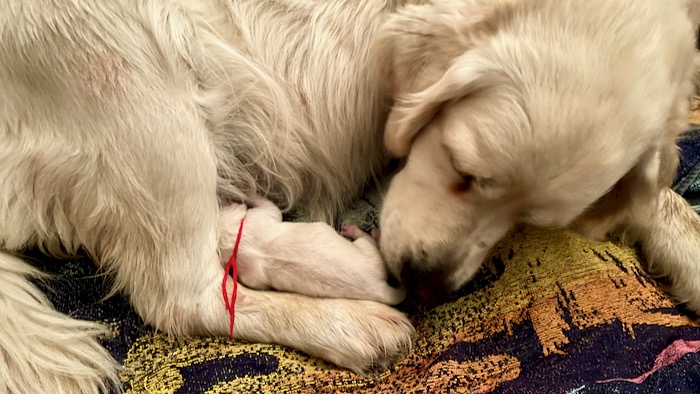 Už ve středu v noci byla Gábi neklidná a jak to tak bývá, tak se většinou noc prochodí. U nás to tak bylo. Bylo jí blbě a zvracela. První štěňátko – holčička se narodila ráno v 5,35 hodin a dostala červenou mašlišku. Měla jsem velikánskou radost, že je to holčička a hned jsem věděla, že mi jí poslala moje milovaná Sašenka (prababička). Saša odešla do nebe 7.8. a štěňátka se začala rodit 7.9.