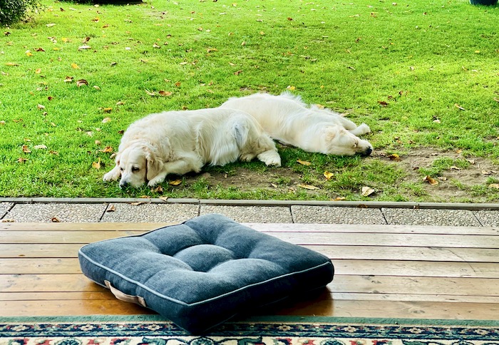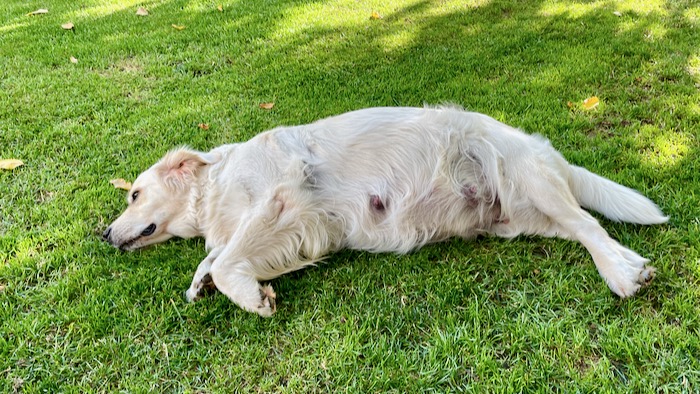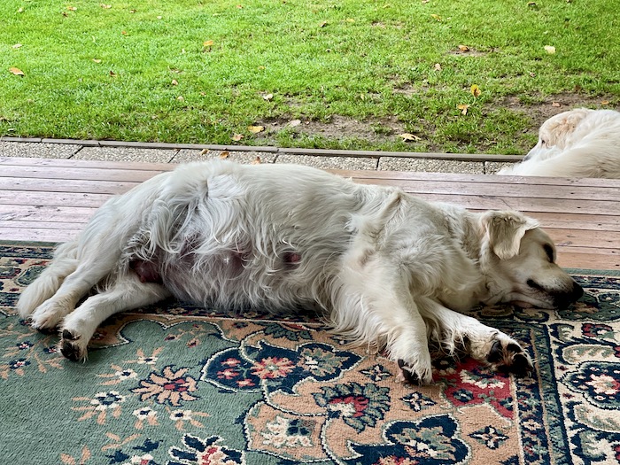 Gábi může začít každým dnem rodit, už by mohla. Ale zatím je klidná a tak z toho asi nic nebude. Je nádherné počasí a tak štěňátka krásně dopéká na sluníčku. Nevím kolik jich v bříšku nosí. Na rtg jsme nebyli, nechtěla jsem jí zbytečně stresovat a tak se necháme překvapit.