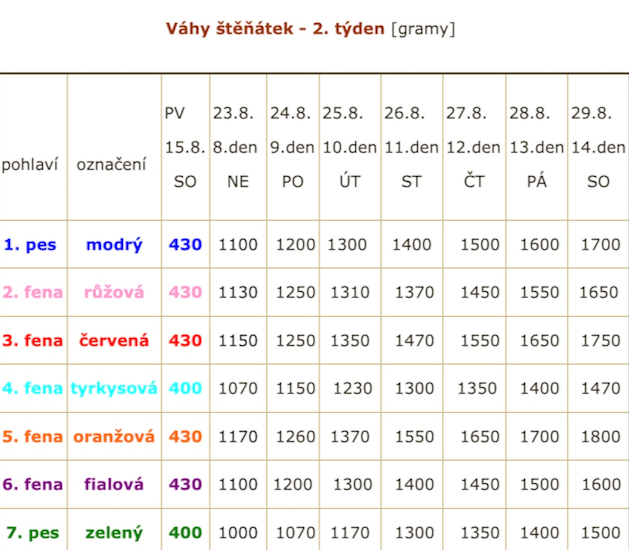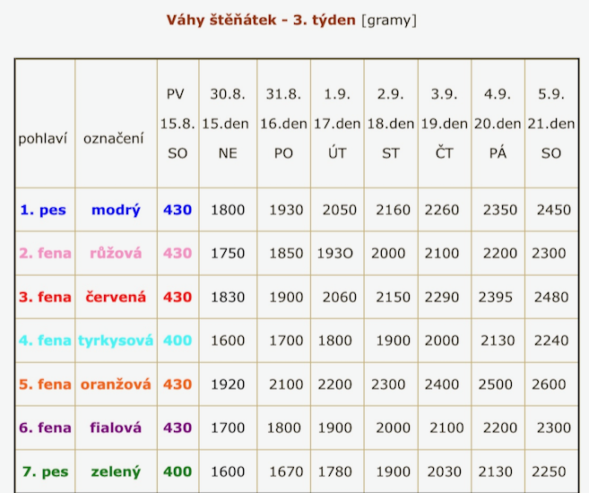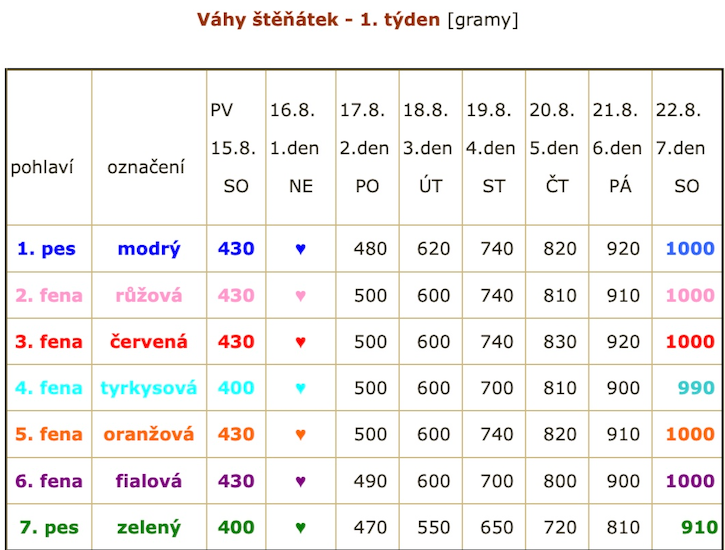 Týden se štěňátky utekl jako voda. Jsou moc hodná, mlíčka mají od Andělky hodně a to je vidět i v tabulce nahoře. Štěňátka zdvojnásobila svoji porodní váhu už včera. Jsou to cvalíci.  Šňůrky jsem jim měnila každý druhý den, tak jsem jim dnes dala oboječky. Andělka začala odcházet z porodní bedýnky a leží vedle. Ke štěňátkům chodí na kojení a na hygienu :). Nesmí ale žádné zapískat, to je u nich pak okamžitě a chlácholí.