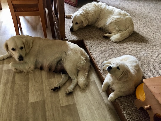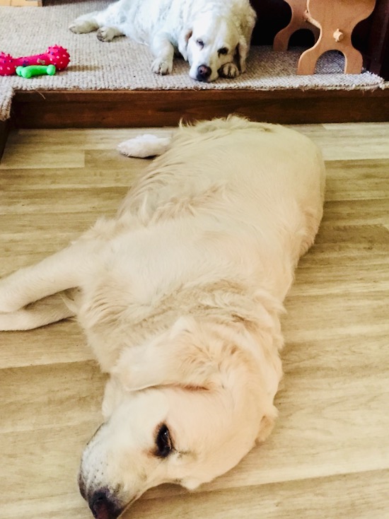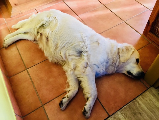 Andělka hodně polehává a opečovává se. Pořád loudí něco na zub :-). Dnes jsme už jsme připravili do obýváku porodní bednu, aby si zvykala a ve které by měla být cca měsíc se svými štěňátky. No zatím dělá, že ji nevidí a leží na chladné zami. Tak uvidíme časem, sand si zvykne, však už ji zná.