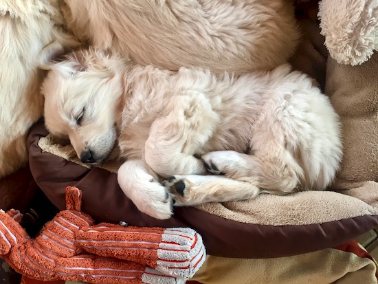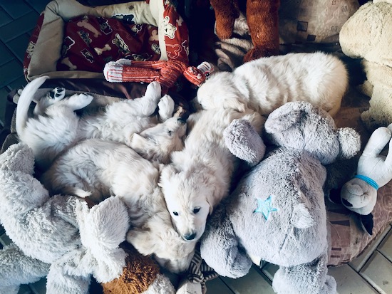 Štěňátka se mají čile k světu. Stále spí a pijí mlíčko. Andělka ho má opravdu hodně. Dokonce se stává, že by potřebovala kojit, ale štěňátka jsou tak najeděná, že spí a ani neví, že k nim mamina přišla.