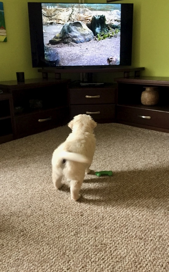 Štěňátka už jsou demoliční četa. Na co přijdou to okusují. Hodně si spolu hrají, ale i se pošťuchují, honí se a vrčí na sebe a zkrátka zkoušejí kdo z koho.  Jsou to hry na lov, dominanci a hierarchii. Většinu dne jsou venku a trochu se děsím deště, které má v těchto dnech přijít.