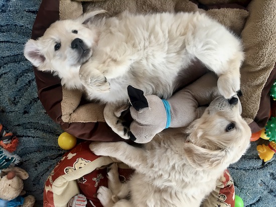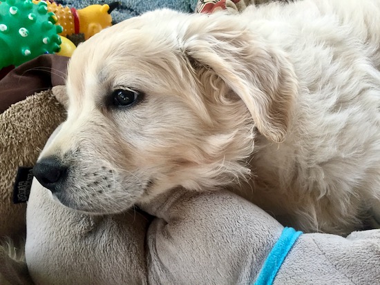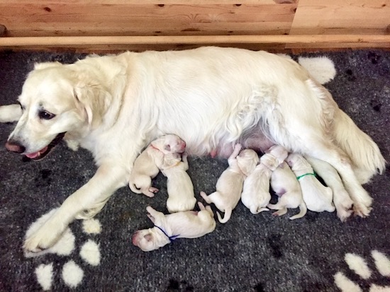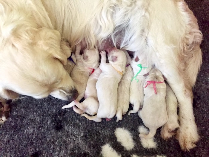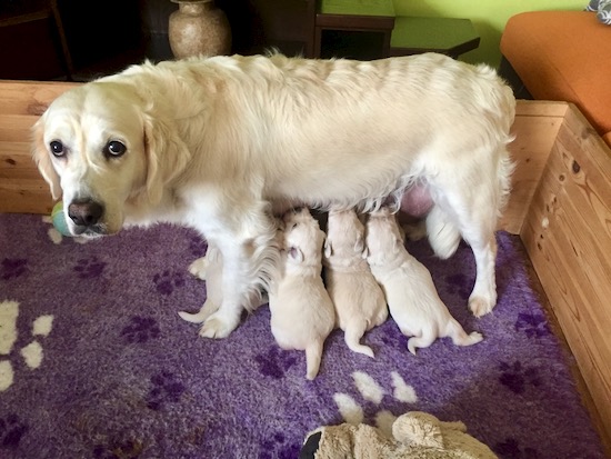Andělka  v noci kojí cca po 3. hodinách, ale přes den je u nich víc. Když jí pustím ven na venčení a zapomenu, že je venku, tak si pro mě přijde a štěkne si, abych jí pustila domů za dětičkami. Je úžasná. I když už jí kojení musí bolet, když prckové mají zoubky jako jehličky. Drápky jsem jim podruhé ostříhala, ale se zoubky nic nenadělám 🙂