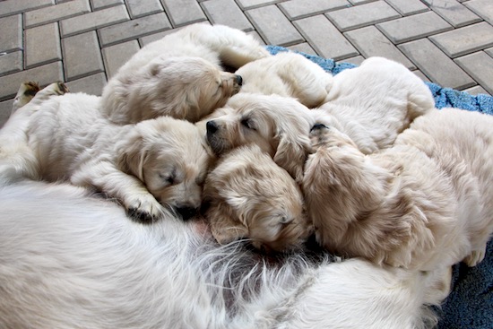 Nic zvláštního se neděje a to je dobře. Štěňátka spí, pijí a zase spí a když je večer zvážím, tak se nestačím divit o kolik zase přibrala. Andělka u nich celý den leží a štěňátka jsou pořád přisátá u cucíků :-). A tím, jak je jich sedm, tak se krásně vejdou, takže mléčný bar jede non-stop.