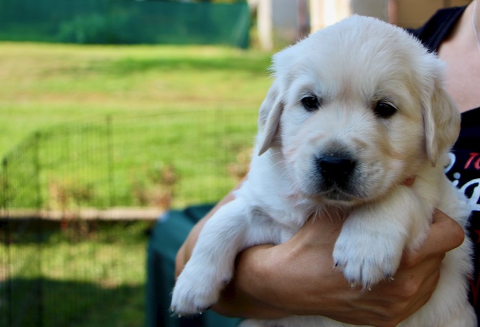 Je krásné počasí, tak štěňátka chodí na celé odpoledne ven do ohrádky. Sourozenecké hrátky a bitky jsou na denním pořádku a to je asi baví nejvíce. A potom, když si s nimi hraje Andělka. Krásně reagují na moje zavolání a dožadují se hlazení a chování v mé náruči.