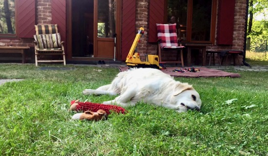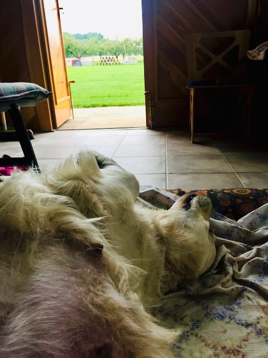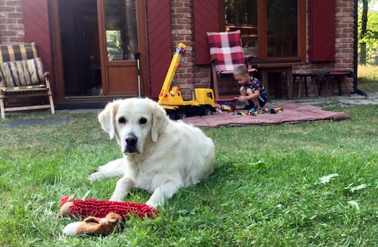 Andělka se doufám cítí dobře, bříško roste a chuť k jídlu také, takže je vše tak jak má být. Teď jsme byli týden na chatě a mohli jsme se v těch vedrech osvěžovat v řece. Jinak už na žádné dlouhé procházky nechodíme. Dnes večer jsem poprvé zaznamela, že si nejspíš hledá úkryt pro svoje dětičky, nebo si ho spíš vyráběla. Hrabala díru a jelikož bylo po dešti, tak přišla jako hliněná kulička 🙂